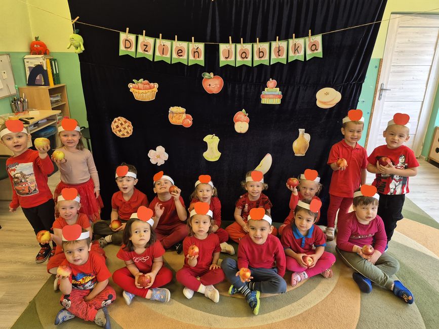 W grupie „Krasnoludki” i „Poziomki” obchodzono „Dzień Jabłka”. Tego dnia dzieci przyszły do przedszkola ubrane w kolorze czerwonym, nawiązując do barwy ulubionych jabłek.