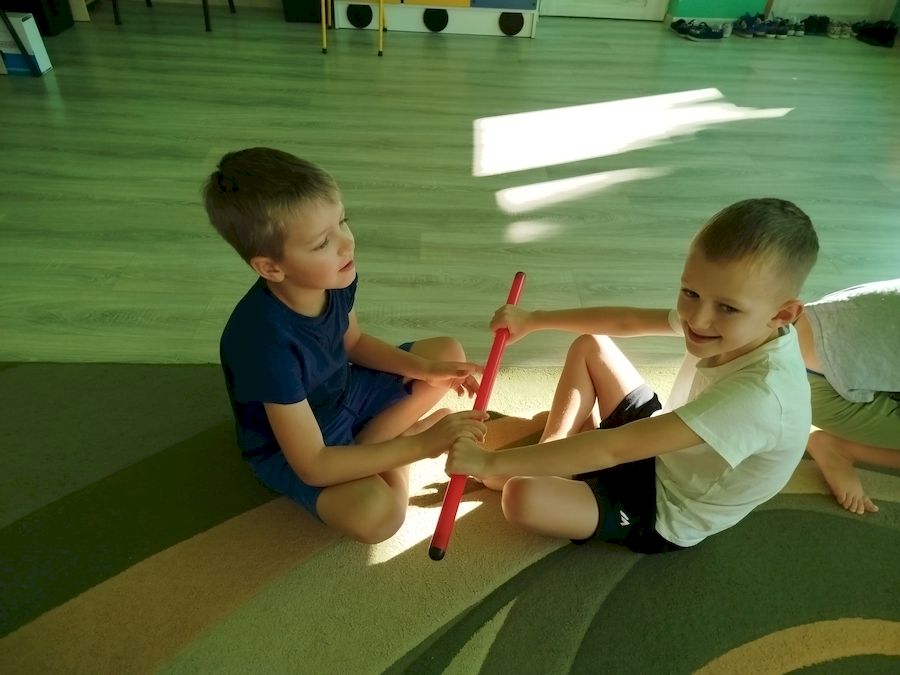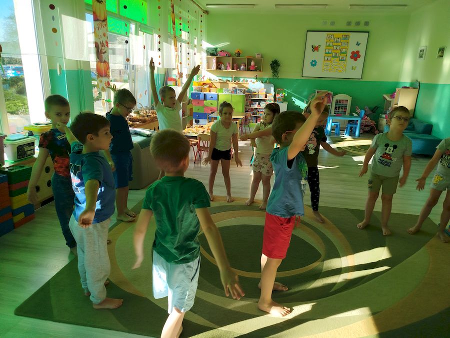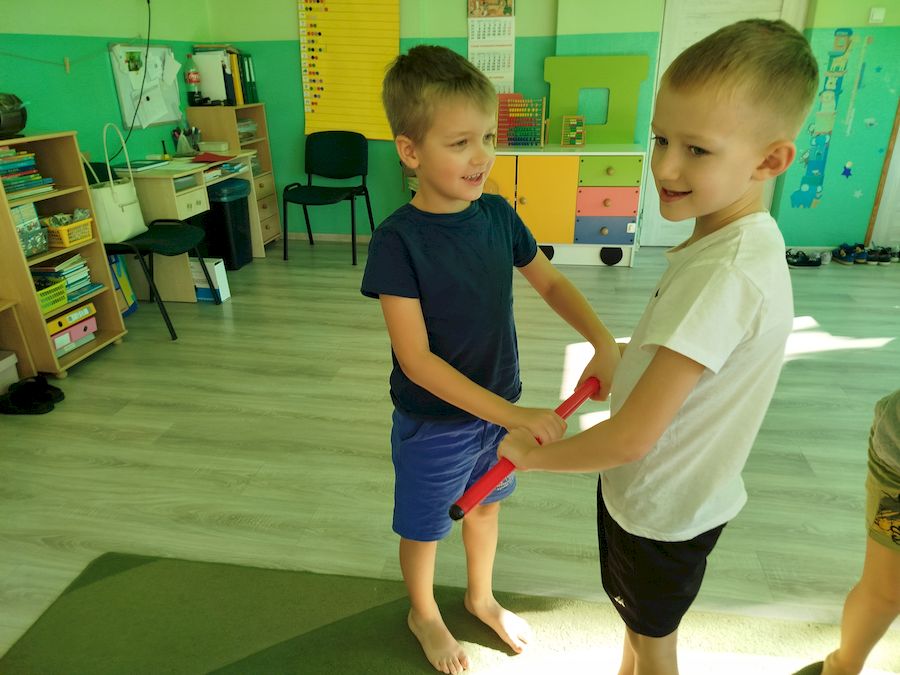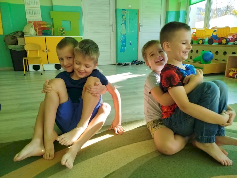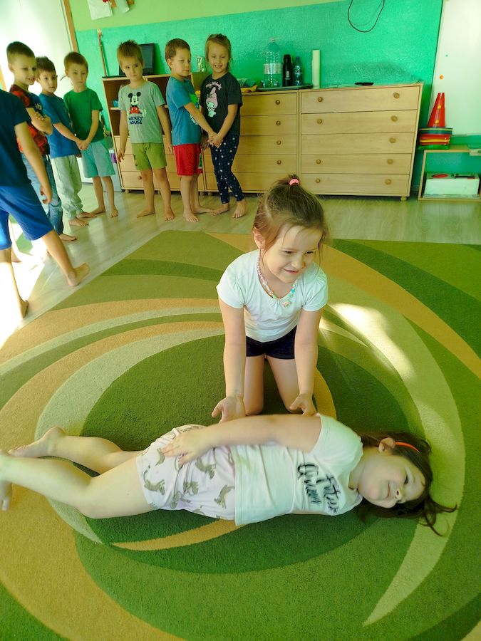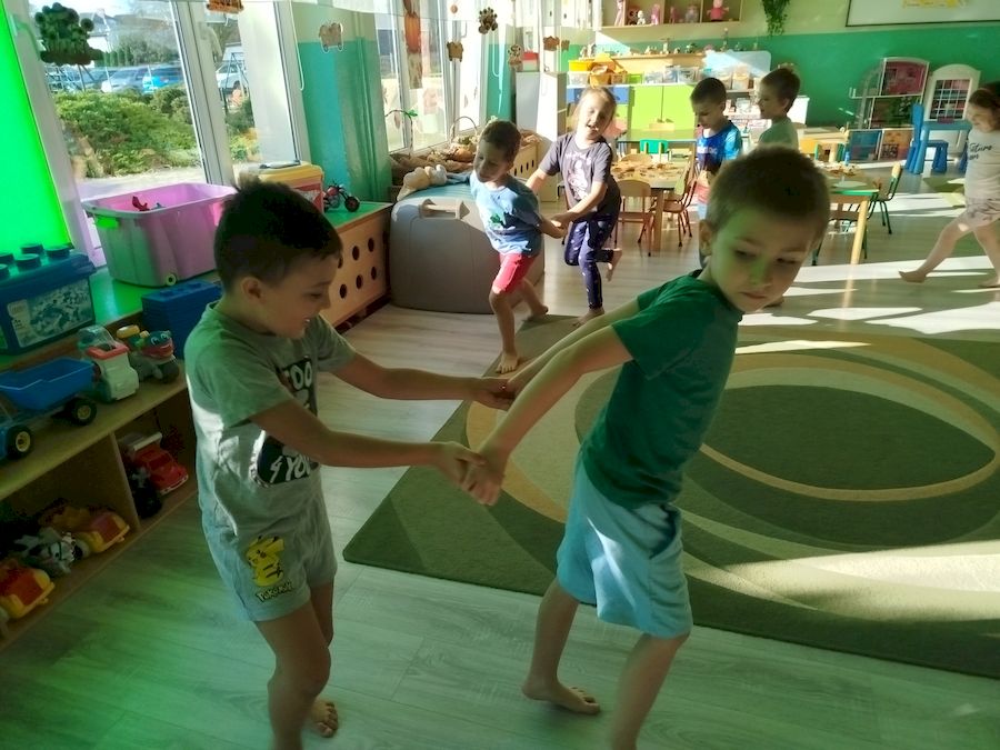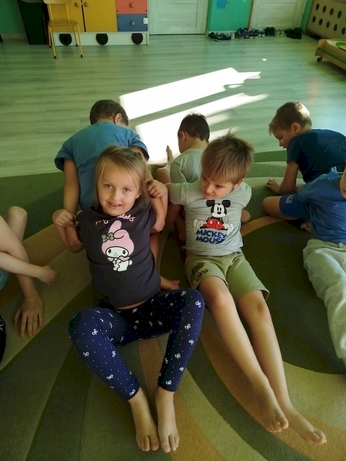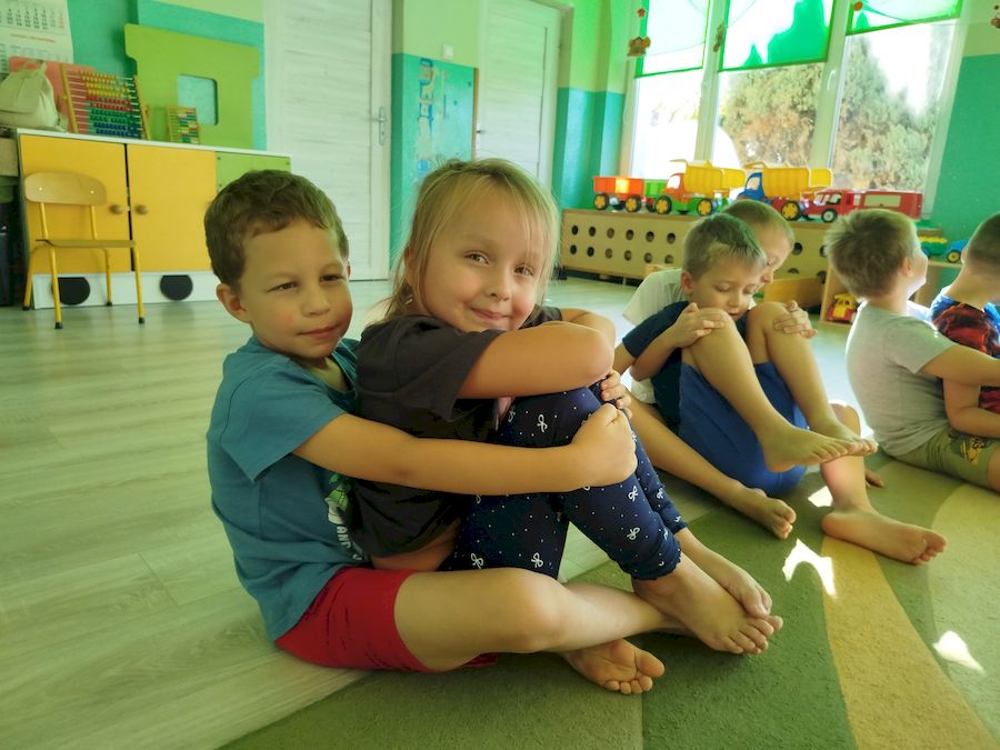 Nie zabrakło też ruchu! Codzienne spacery i zabawy na świeżym powietrzu, a oprócz tego ćwiczenia gimnastyczne z elementami metody Ruchu Rozwijającego Weroniki Sherborne. Ta wyjątkowa forma ćwiczeń nie tylko poprawia sprawność fizyczną, ale również uczy współpracy w parze, buduje zaufanie do koleżanki i kolegi oraz wpływa na budowanie pozytywnych relacji w grupie.