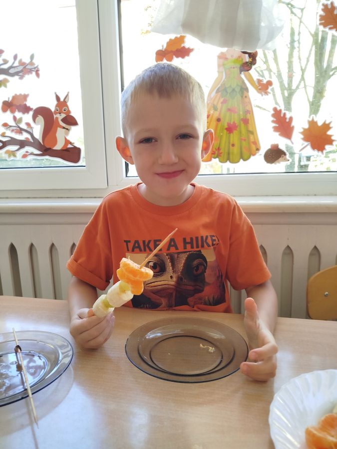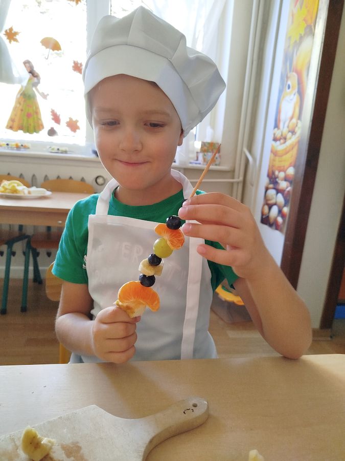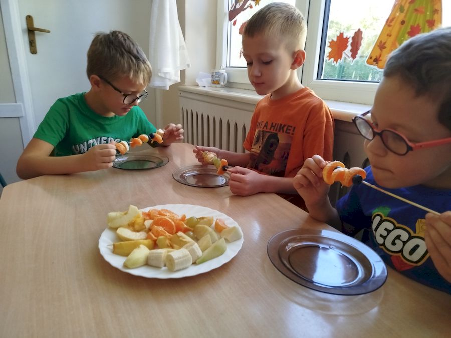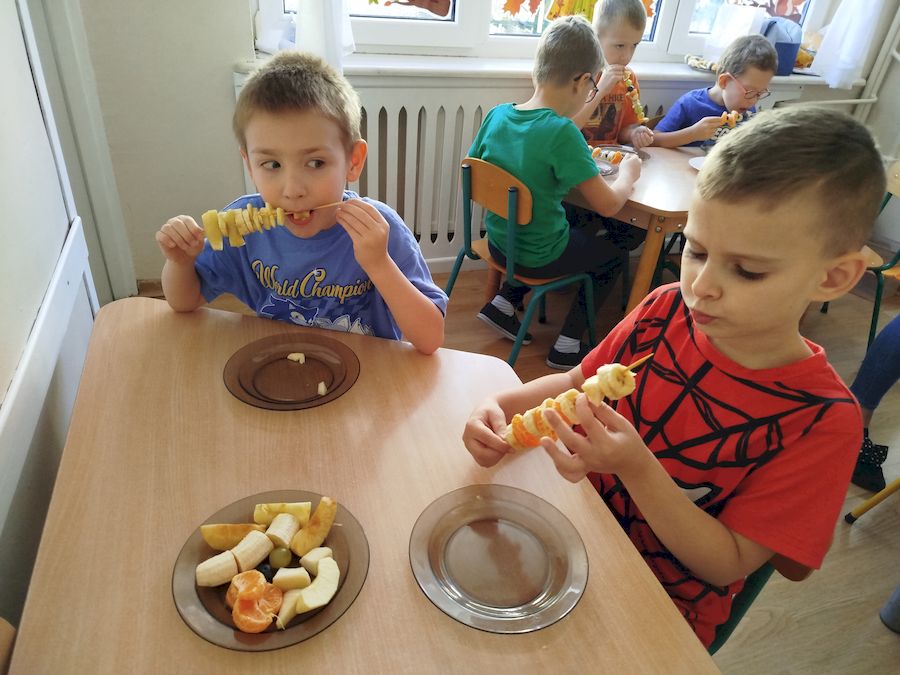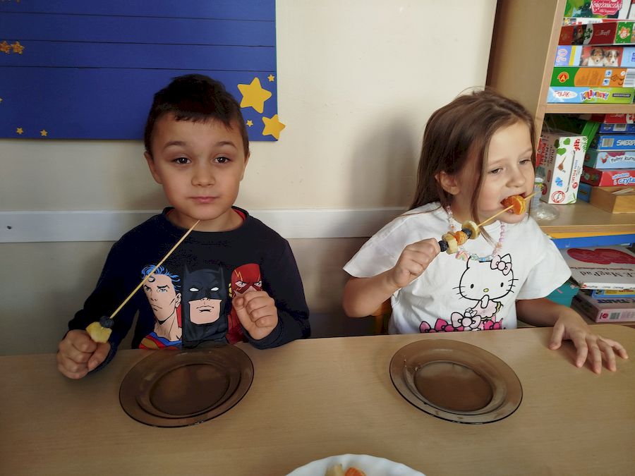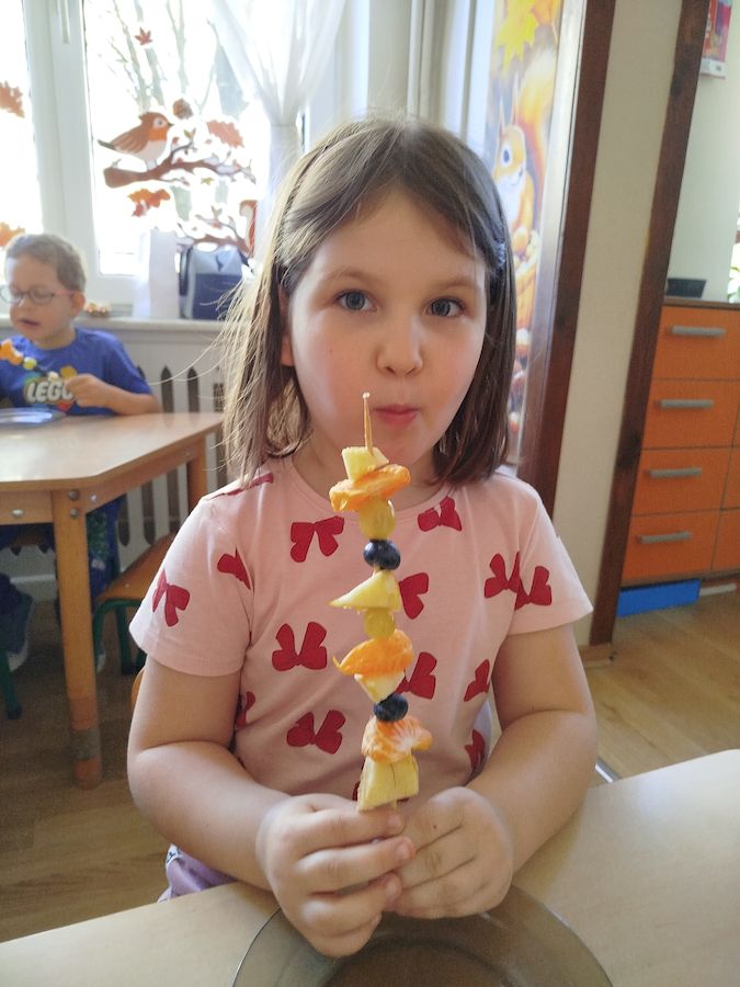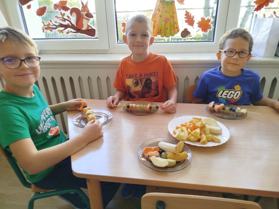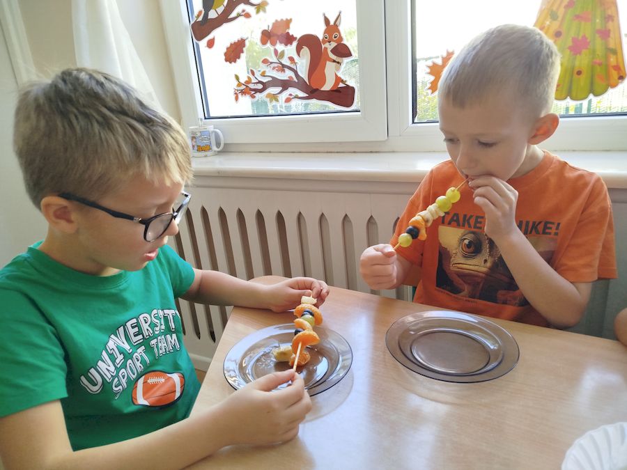 Zainspirowani ich przykładami, postanowiliśmy również przygotować się do zimy, dbając o naszą odporność i dobre samopoczucie. Aby wzmocnić organizm przygotowaliśmy pyszne szaszłyki owocowe – pełne witamin i kolorów! To była nie tylko zdrowa, ale też bardzo smaczna zabawa, podczas której każdy samodzielnie skomponował swój zestaw ulubionych owoców.