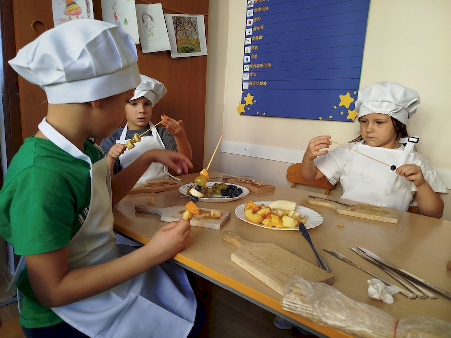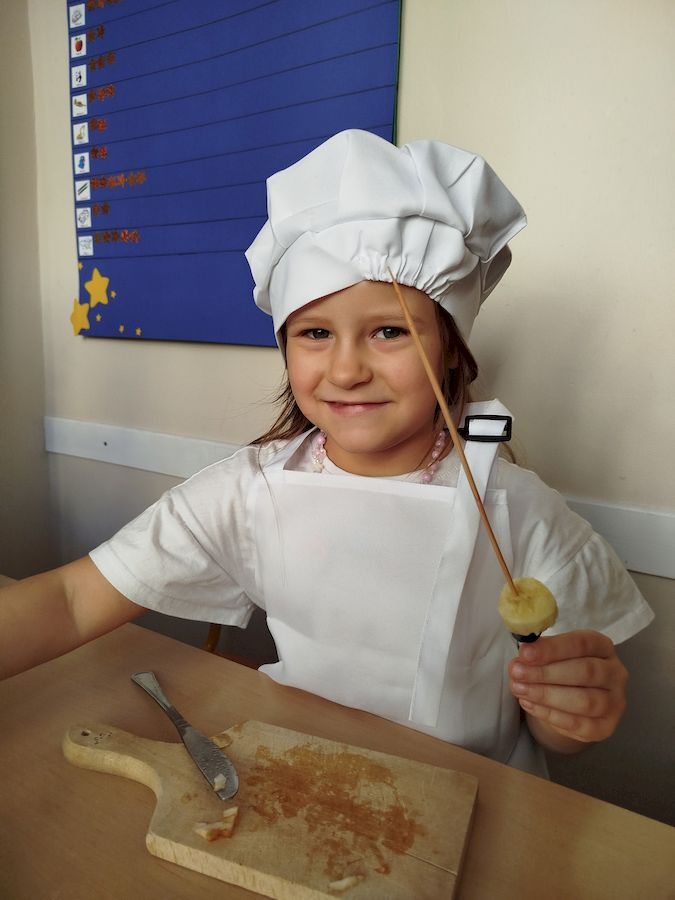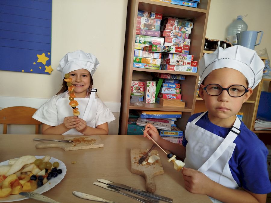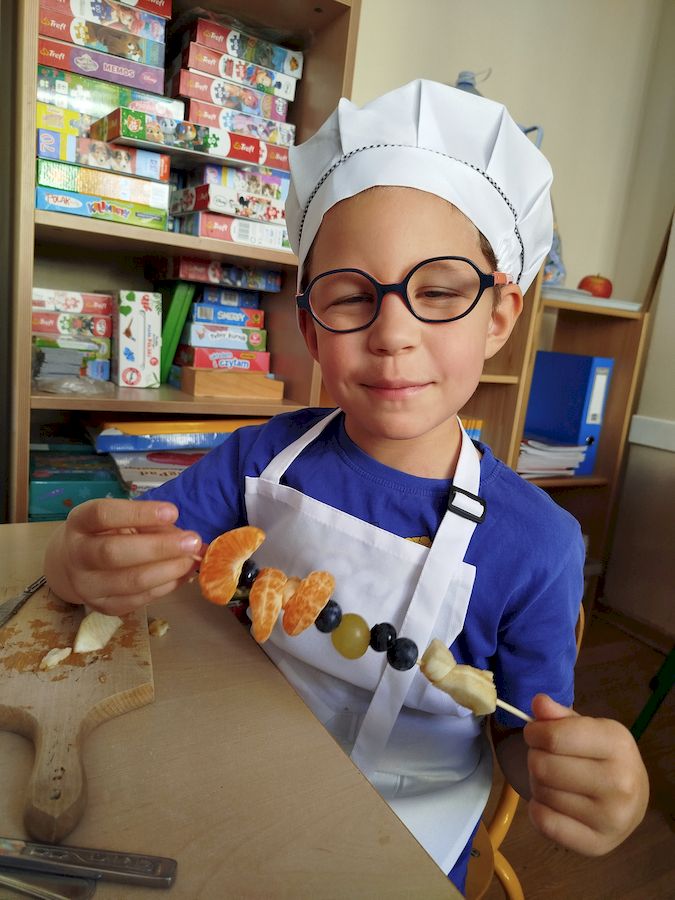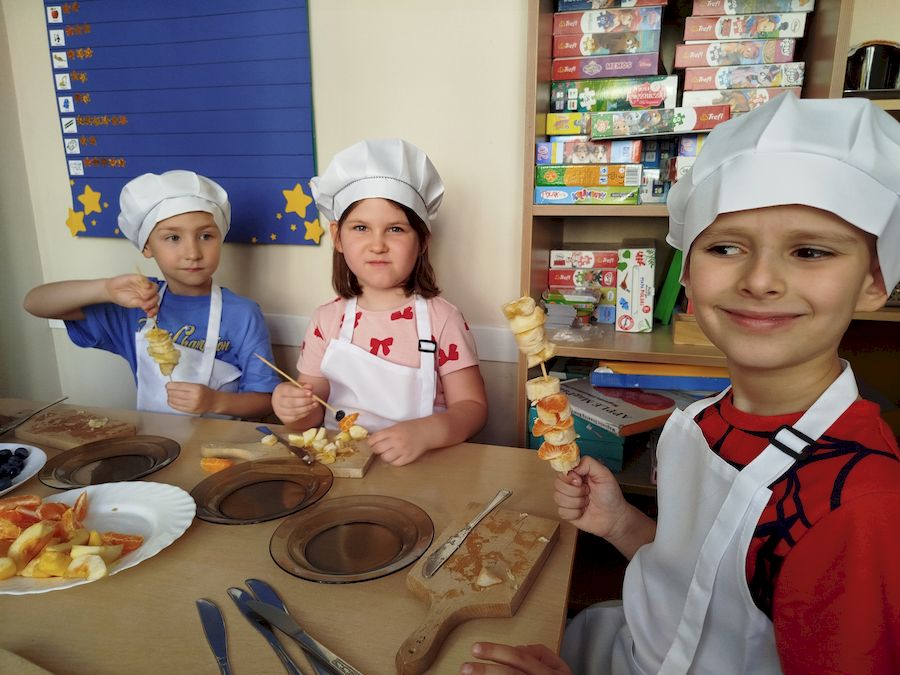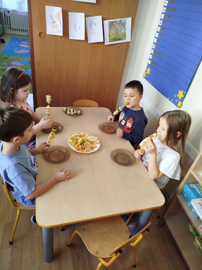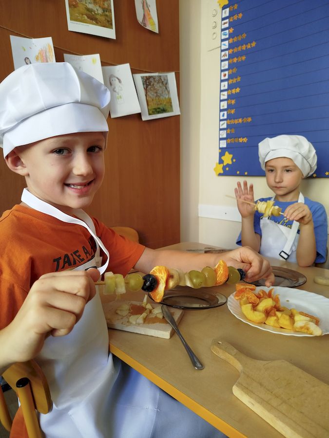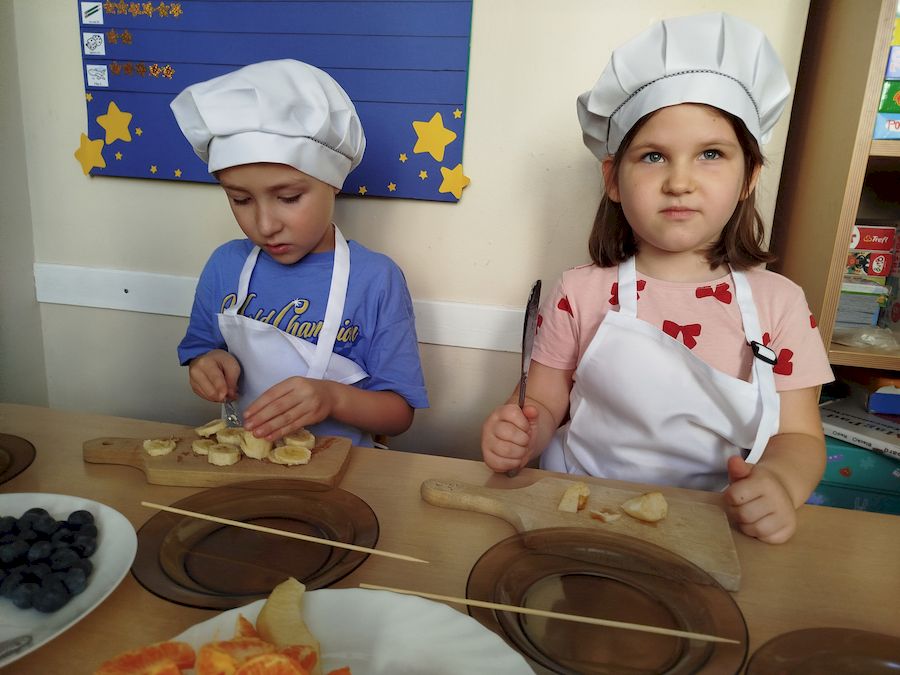 Zainspirowani ich przykładami, postanowiliśmy również przygotować się do zimy, dbając o naszą odporność i dobre samopoczucie. Aby wzmocnić organizm przygotowaliśmy pyszne szaszłyki owocowe – pełne witamin i kolorów! To była nie tylko zdrowa, ale też bardzo smaczna zabawa, podczas której każdy samodzielnie skomponował swój zestaw ulubionych owoców.
