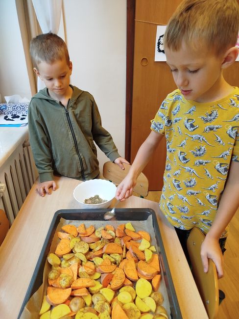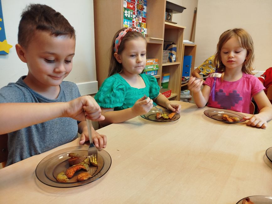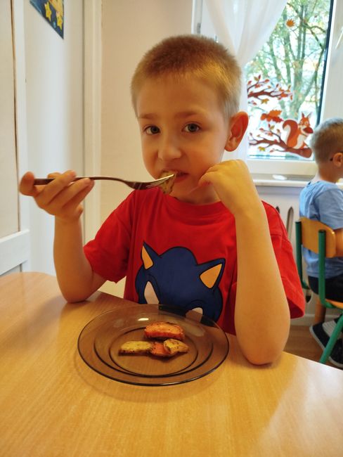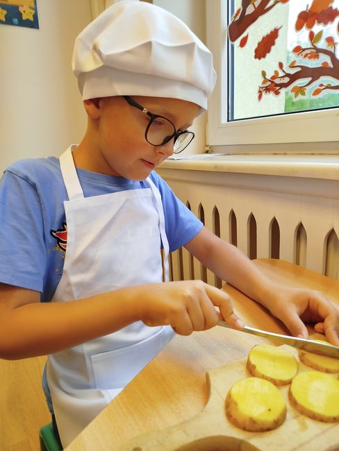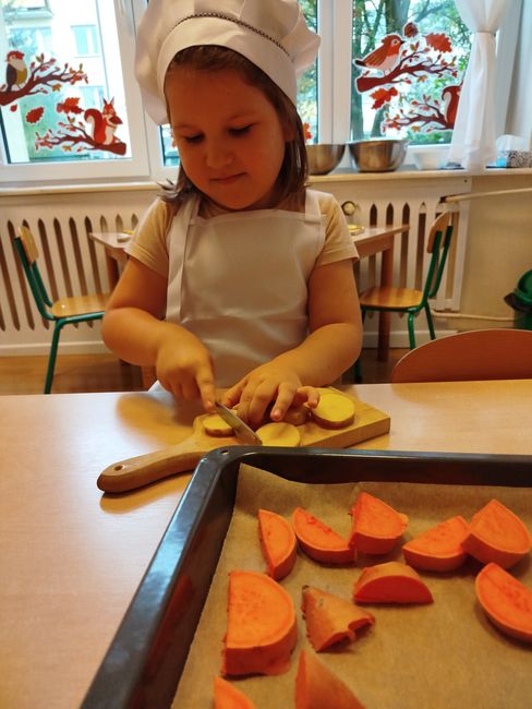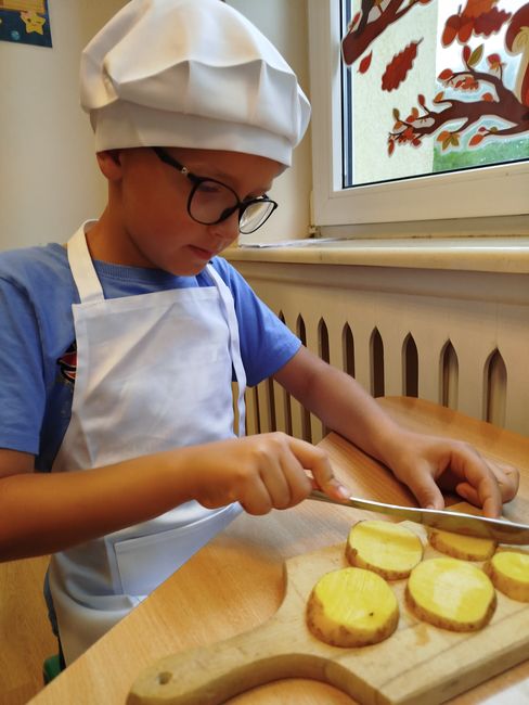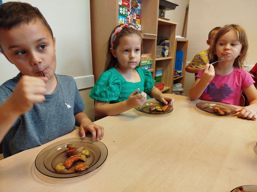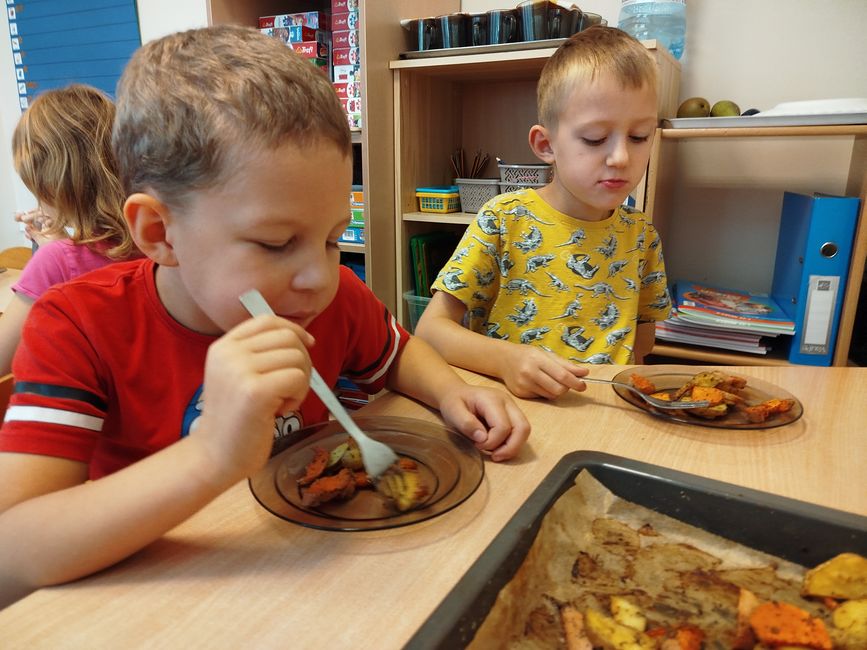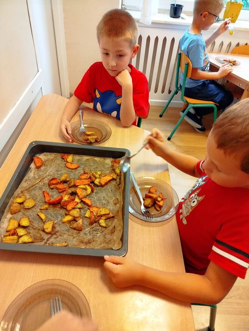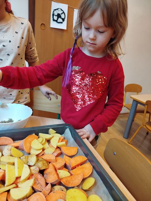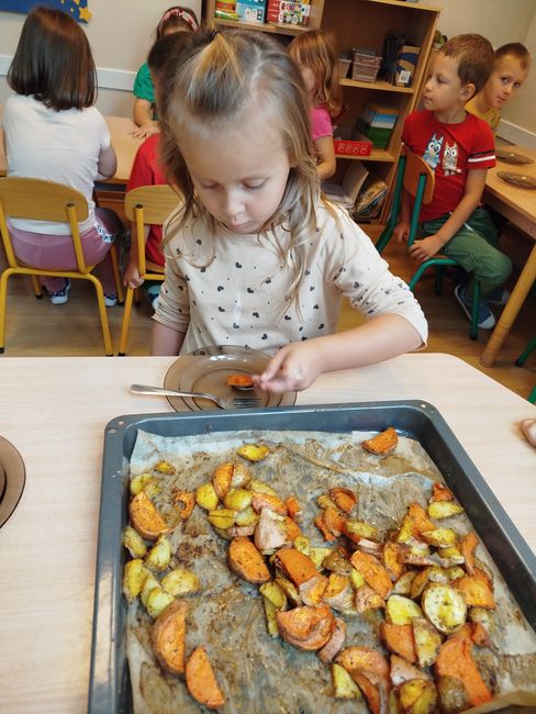 Ten dzień był nie tylko radosnym powitaniem nowej pory roku, ale również doskonałą okazją do nauki poprzez działanie, odkrywanie i doświadczanie. Największą atrakcją było wspólne pieczenie ziemniaków. Dzieci przy okazji zajęć kulinarnych dowiedziały się skąd pochodzą ziemniaki i dlaczego na wsi od dawna jesienią urządzano ogniska z pieczonymi kartofelkami. Z zaciekawieniem oglądały ziemniaczane bulwy, a po zajęciach praktycznych - kosztowały upieczonych ziemniaczków.