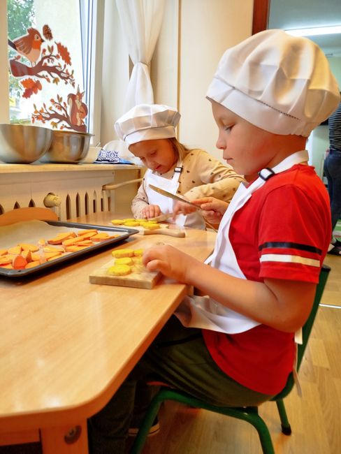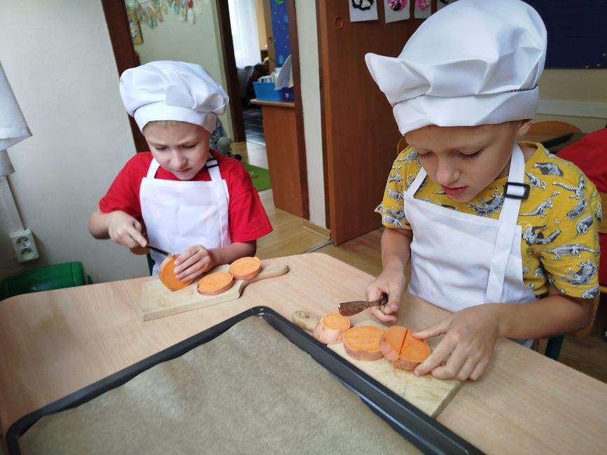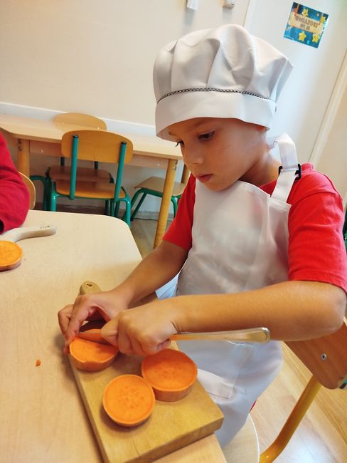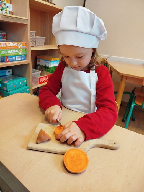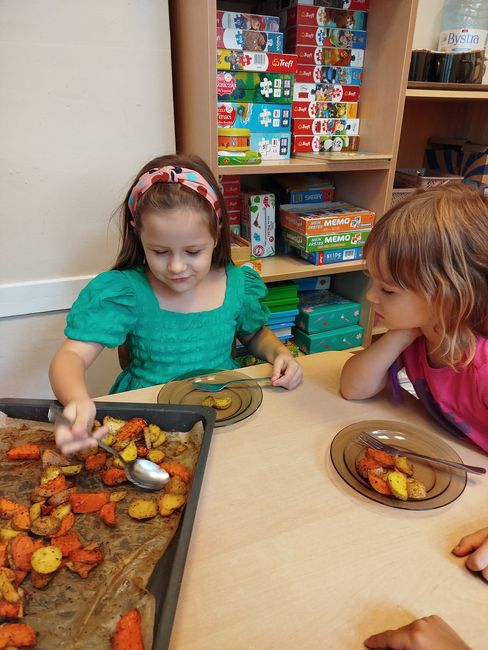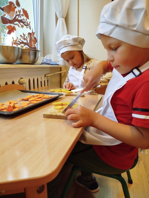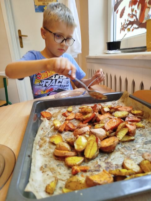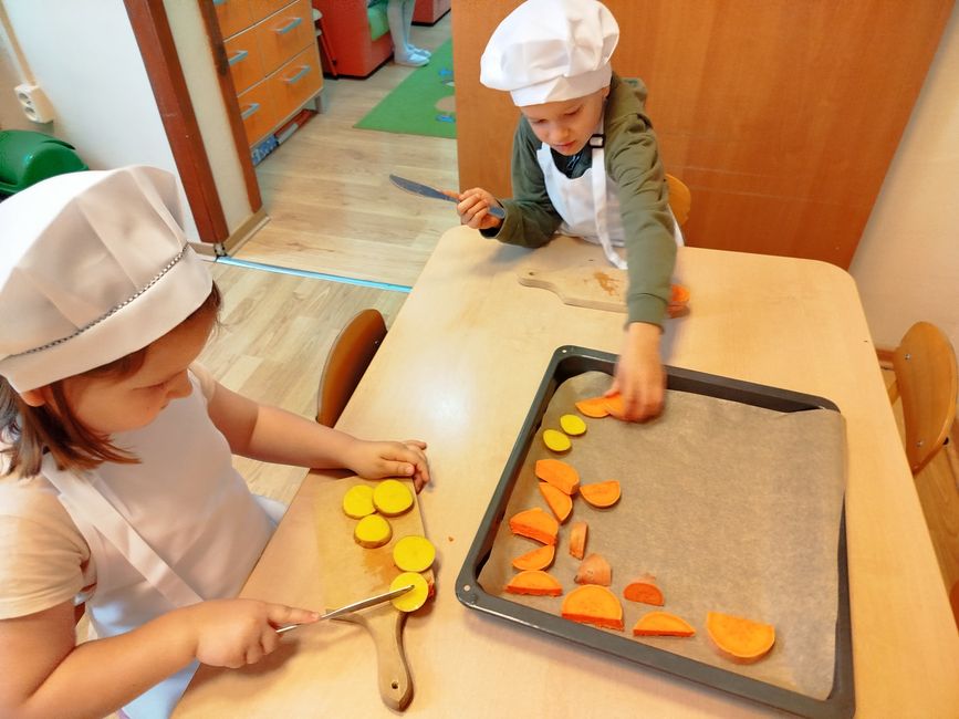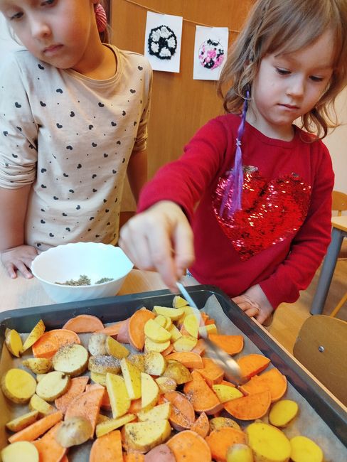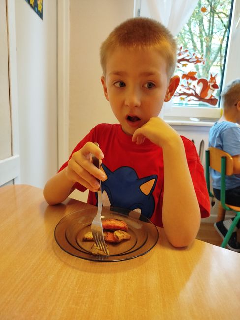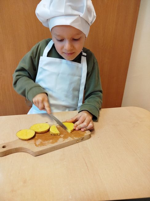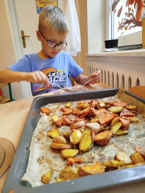 Ten dzień był nie tylko radosnym powitaniem nowej pory roku, ale również doskonałą okazją do nauki poprzez działanie, odkrywanie i doświadczanie. Największą atrakcją było wspólne pieczenie ziemniaków. Dzieci przy okazji zajęć kulinarnych dowiedziały się skąd pochodzą ziemniaki i dlaczego na wsi od dawna jesienią urządzano ogniska z pieczonymi kartofelkami. Z zaciekawieniem oglądały ziemniaczane bulwy, a po zajęciach praktycznych - kosztowały upieczonych ziemniaczków.