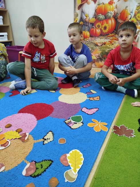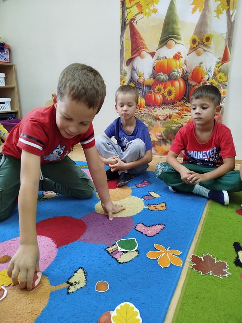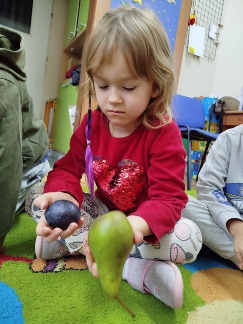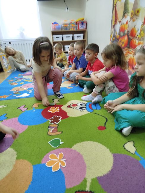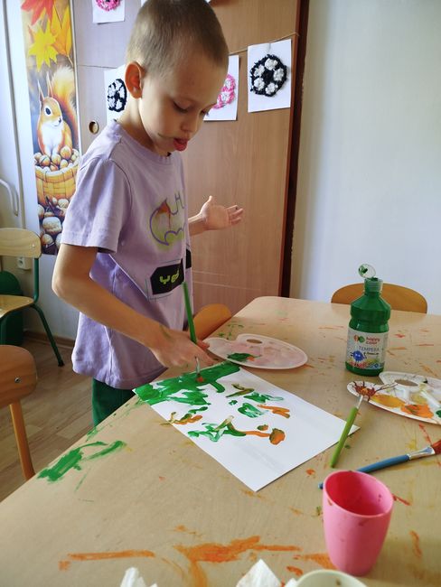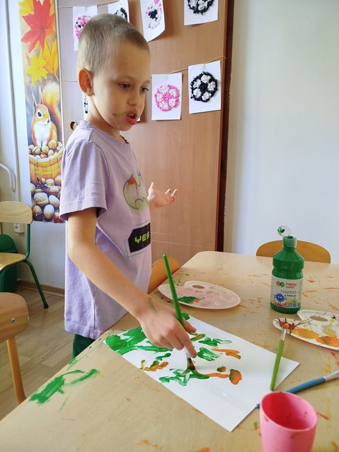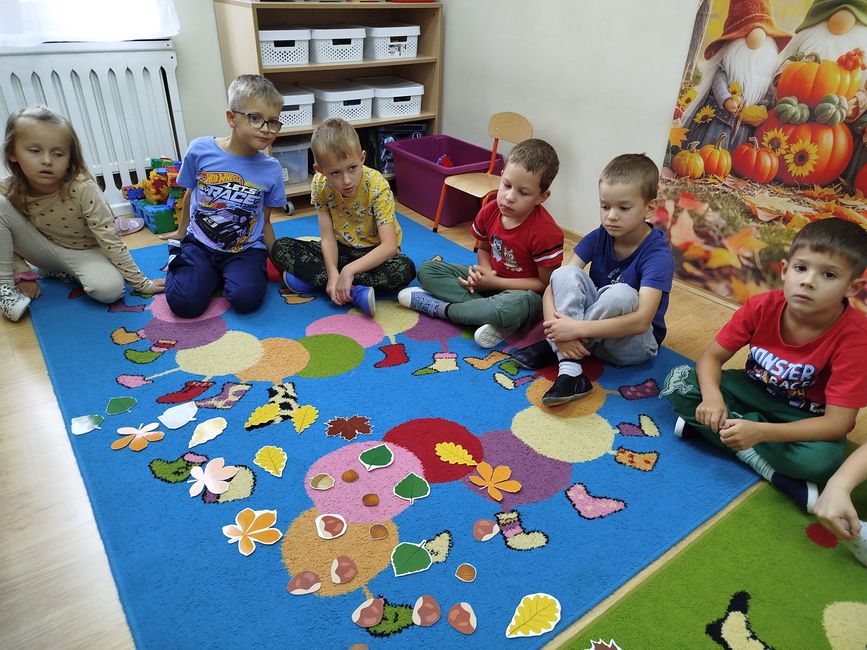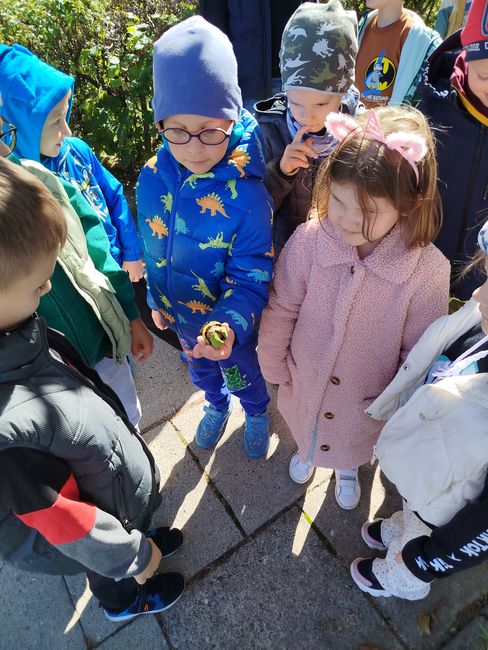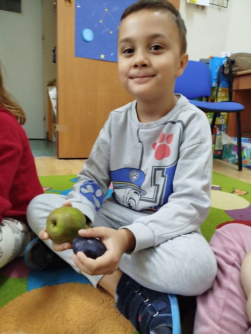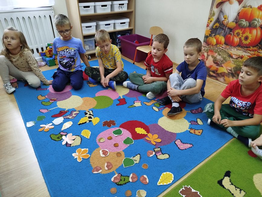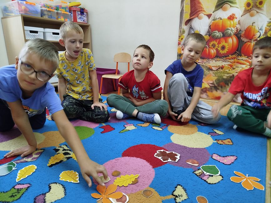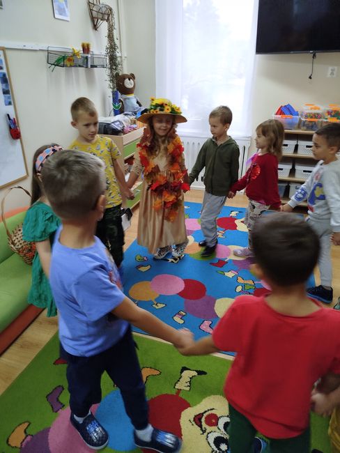 Dzień rozpoczął się od ciekawej prezentacji multimedialnej, która przybliżyła dzieciom zmiany zachodzące w przyrodzie jesienią. Podczas spacerów w okolicach przedszkola, dzieciom udało się znaleźć wiele darów jesieni, m.in.: kasztany, żołędzie, orzechy oraz owoce i warzywa typowe do tej pory roku.