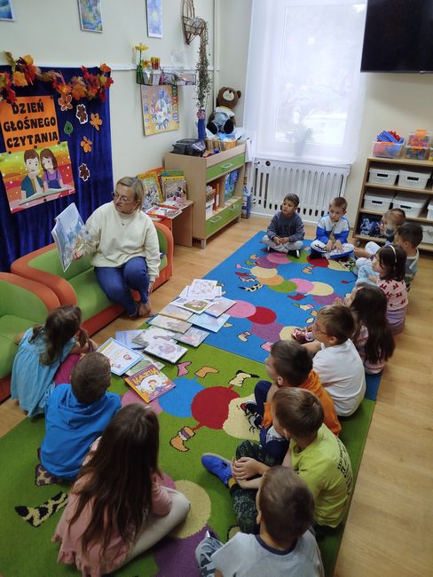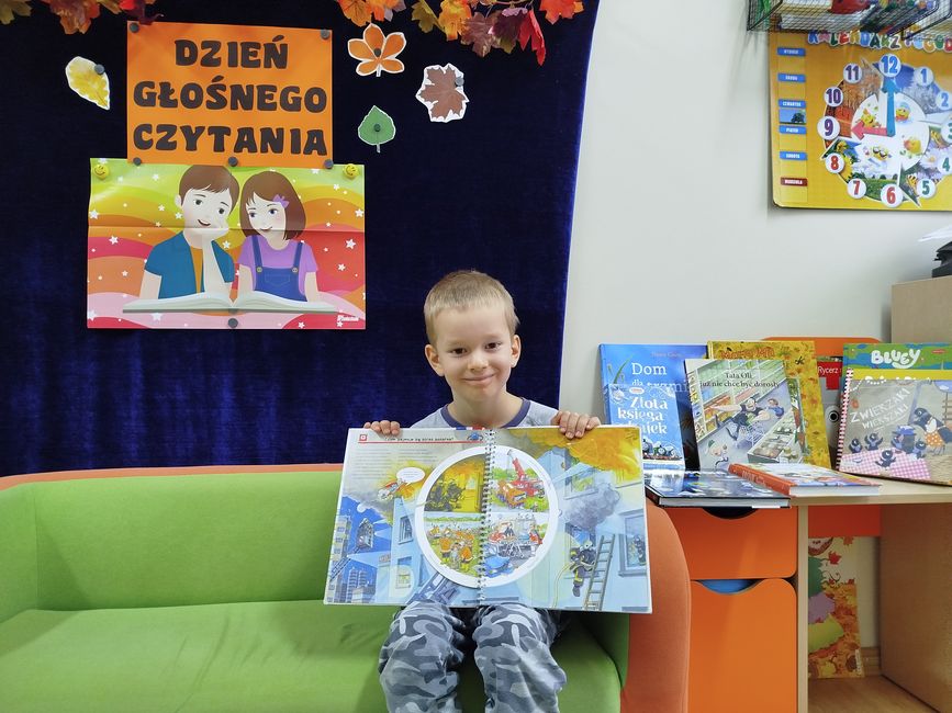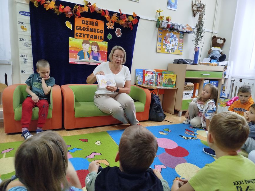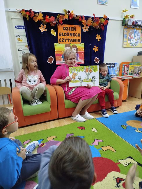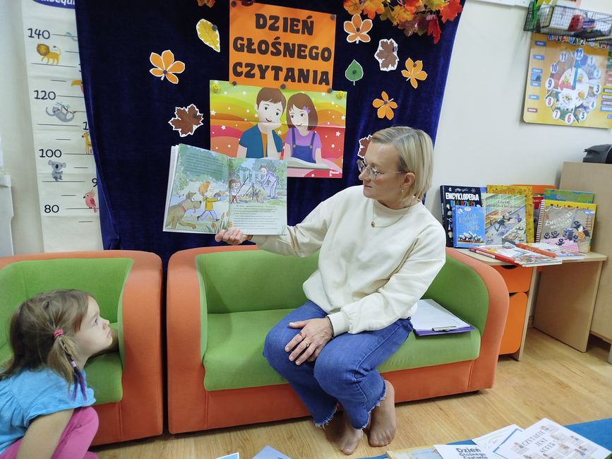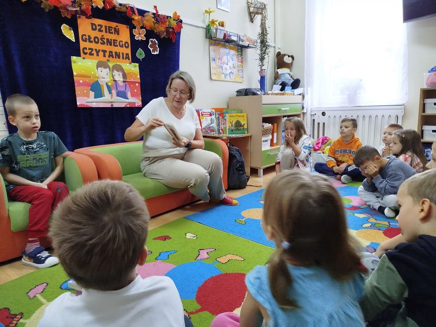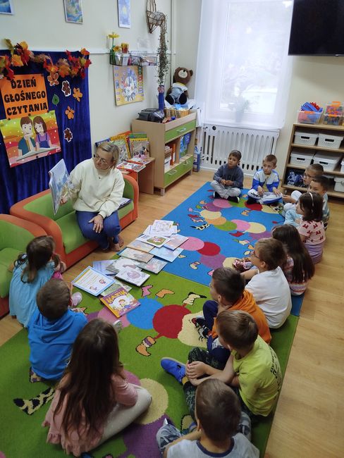Dzieci przyniosły do przedszkola swoje ulubione książeczki, o których bardzo chętnie opowiadały. Bardzo chcieliśmy poznać wszystkie, dlatego zaprosiliśmy gości, którzy z radością dołączyli do wspólnego czytania. Jako pierwsza czytała pani Anetka - nasza nauczycielka języka angielskiego, która zaprezentowała dzieciom klasyczną bajkę „Goldilocks and the Three Bears” („Złotowłosa i trzy niedźwiadki”). Przedszkolaki z zainteresowaniem słuchały opowieści w języku angielskim, a przy okazji poznawały nowe słowa. Następnie odwiedziła nas pani Wiola z pobliskiej biblioteki, która nie tylko przeczytała dzieciom ciekawą historię, ale także przygotowała zabawy związane z książkami oraz drobne upominki. Do wspólnego czytania przyłączyły się również pani dyrektor oraz pani intendenta, które wprowadziły dzieci w świat kolejnych bajkowych przygód. To był fantastyczny dzień, ponieważ wspólne czytanie połączyło dzieci i dorosłych w kolorowej krainie książek i fantazji.